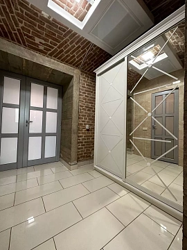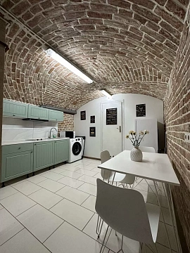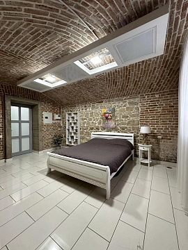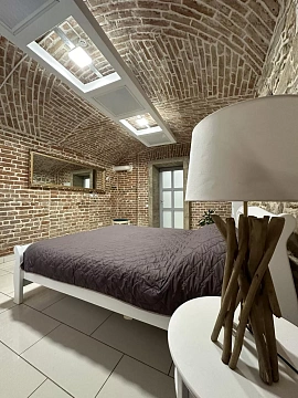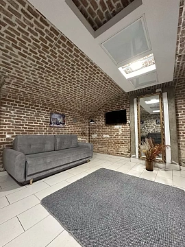 Апартаменты расположены в одном уровне спальня имеет полноценное окно и выход на террасу во двор, гостиная в полуцокольном уровне. Площадь 75м2.