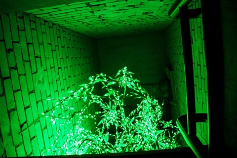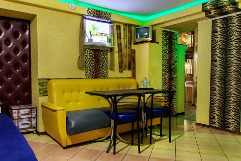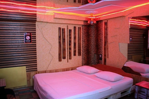 Двухкомнатный номер без окон с двуспальной кроватью, джакузи и кинопроектором, зеркальными стенами и потолками, создающими романтическую атмосферу. Секретная комната с светодиодным деревом добавляет сказочность, а красное неоновое освещение подчеркивает уникальность пространства. Номер оснащен всем необходимым для комфортного пребывания; идеально подходит для романтики или компании друзей.
