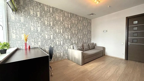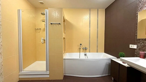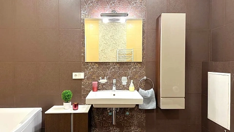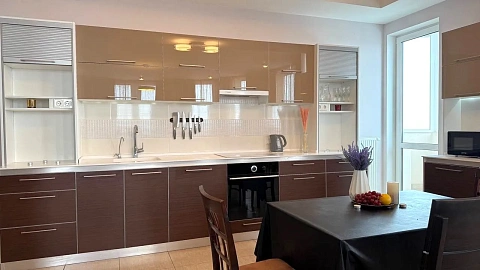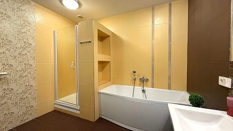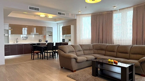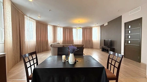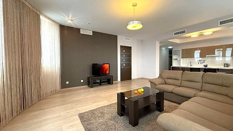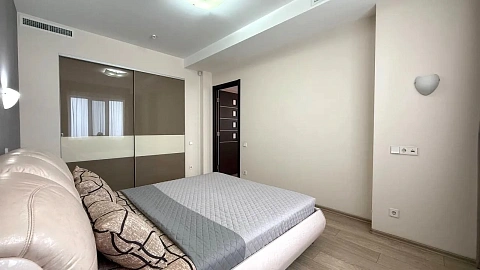 Функциональная кухня с большим холодильником, посудомойкой, духовкой, скрытыми полками, обеденным столом, выход на балкон, просторный зал с диваном. Основной санузел с душевой, ванной и биде. Гостевой санузел со скрытым бойлером и стиральной машиной. В коридоре встроенный шкаф купе