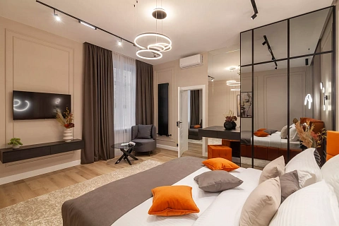 Квартира находится в части древнего центра города. Апартаменты оснащены современной мебелью (двуспальная кровать, гардеробная, тумбы, встроенная кухонная мебель, обеденный стол, ванная). Для вашего комфорта есть вся необходимая посуда и бытовая техника (телевизоры с плоским экраном, микроволновая печь, электрочайник, духовка, газовая плита, холодильник, кондиционеры, посудомоечная машина, стиральная машина).