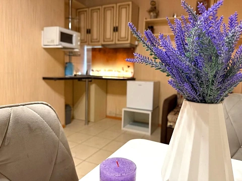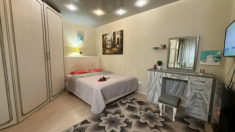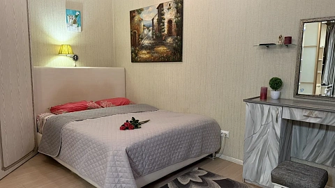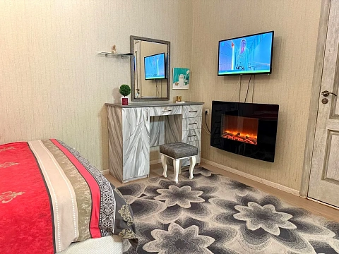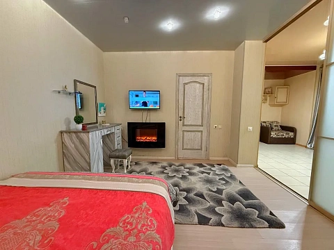 Апартаменты расположены недалеко от центра в современном новостройке «Семь домов». Территория комплекса очень зеленая, рядом парк, есть красивое озеро, что позволяет гостям почувствовать, что они живут не в шумном мегаполисе, а на лоне природы, а ваш дом это островок природного благополучия. терракот с оттенками старого дерева. Дизайнер свободно миксирует природные материалы и современные технологии. Разнообразные подсветки, теплый пол, камин придают интерьеру действительно домашний уют. Территория комплекса охраняется 24/7, есть шлагбаум, паркинг. На территории новостроек есть кафе, аптека, минимаркет. До самого центра города одна остановка метро.