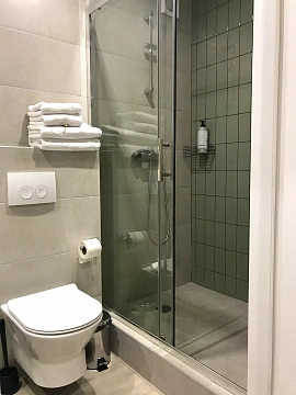 В распоряжении полностью оборудована ванная комната, белые полотенца, белое белье, много места для хранения вещей, и кухня со всеми необходимыми принадлежностями (до мелочей).