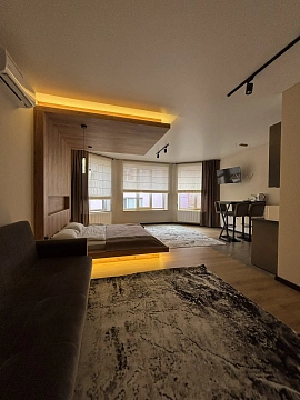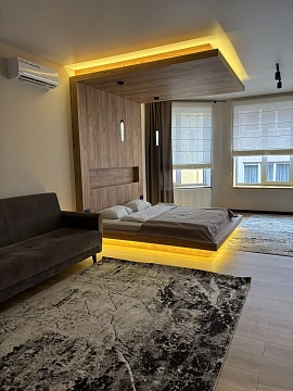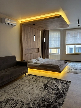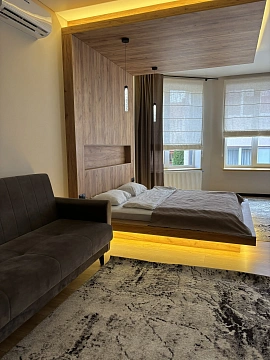 Большой номер с кухней и барной стойкой, где можно как приготовить еду, так и просто отдохнуть попить чай кофе. Отдельное место эта кровать выполнена в индивидуальном дизайне с невероятной подсветкой. Также светлый номер с большими окнами. Но если хочется спрятаться от света, то римские шторы вам помогут. Перед апартаментами есть паркинг с видеонаблюдением.