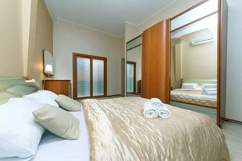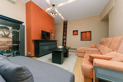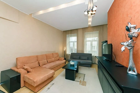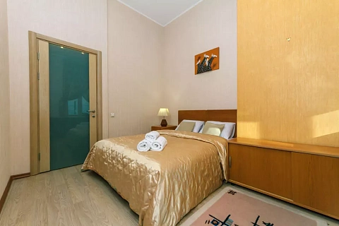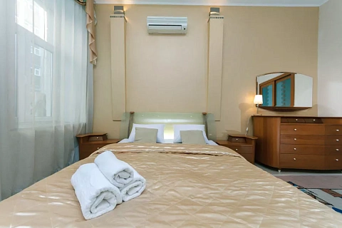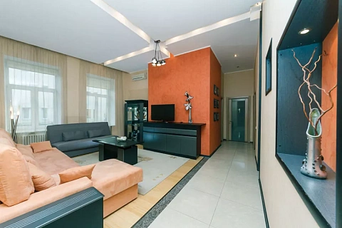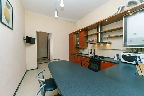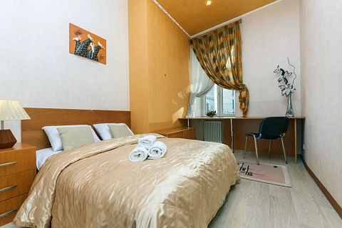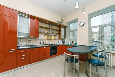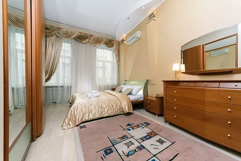 Квартира люкс класса. Чистая, уютная квартира c 2-мя спальнями и гостиной на 1 этаж/5 этажного дома в самом центре Киева. Спальня оснащена 2-х спальной кроватью с ортопедическим матрасом, шкафом-купе, гардеробной комнатой со множеством шкафчиков, тумбочками, зеркалами, кондиционером.  Во второй спальне 2-х спальная кровать, прикроватная тумба, письменный стол и стул.  В гостиной раскладывающийся диван, второй угловой диван не предназначен для ежедневного сна, журнальный столик, кабельное ТВ, Wi-Fi, кондиционер.  На кухне имеется вся бытовая техника и посуда. В ванной комнате: сантехника, стиральная машина, фен, угловая ванна. Предоставляется постельное бельё, полотенца, одноразовые тапочки, гели, шампуни. Рядом торговые центры, супермаркеты, в 2-х минутах ходьбы от м. Майдан Независимости и ТЦ «Глобус», главной улицы города Крещатик, в 15 минутах ходьбы от м. Дворец Спорта, м. Театральная, Бессарабского рынка, Крещатика, бизнес-центра «Парус», "Мандарин Плаза", "Гулливер».  Множество кафе, ресторанов, магазинов. Квартира предназначена для комфортного пребывания шести человек, спальных мест 2+2+2. В квартире запрещено курить!!! Балкона нет.  В доме лифт, чистое парадное, магнитный замок. Возможность организации трансфера. Отчетные документы. Стоимость квартиры может меняться на выходные праздничные дни. При заселении в квартиру берётся залог в размере 100$. Залог возвращается при выезде, при условии, что квартире не нанесен ущерб.