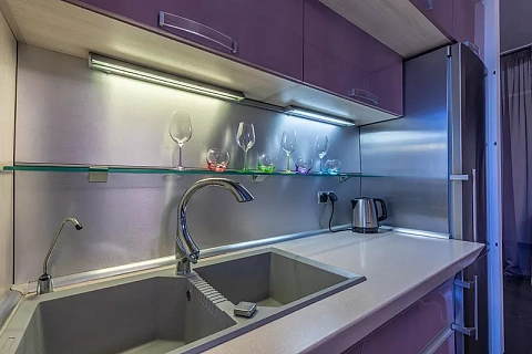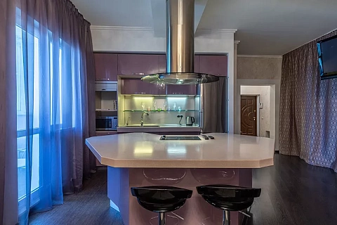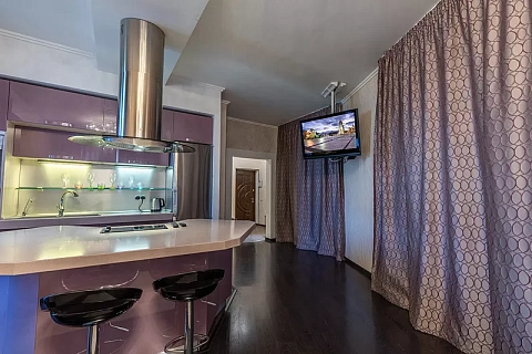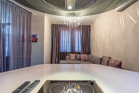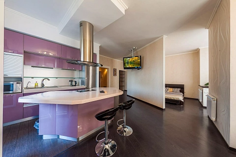 Комфортная гостиная-студия: встроенная кухня, барный стол-остров, диван, двуспальная кровать, гардеробная, LCD телевизор с кабельными каналами на разных языках, подключен WI-FI интернет.