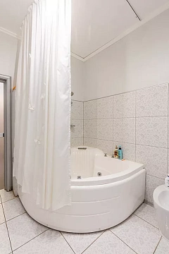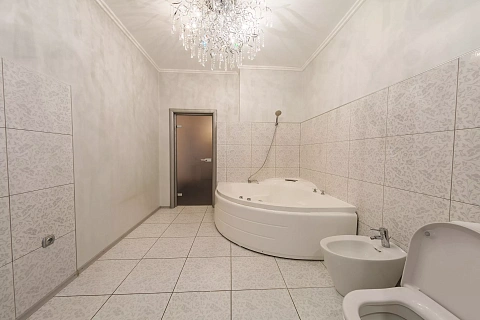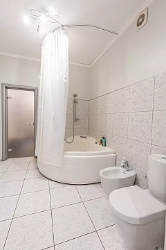 Большая ванная комната, джакузи, биде, бойлер, горячая вода есть всегда, подогрев полов.