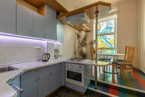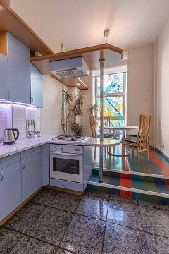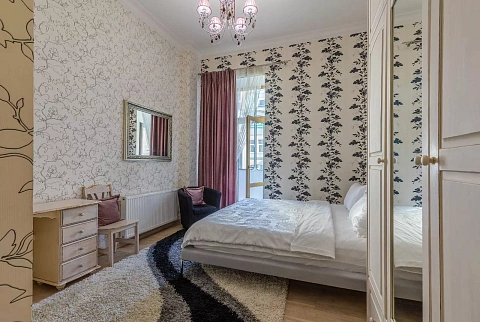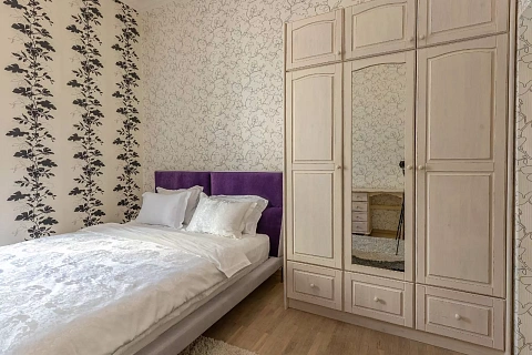 Уникальный дизайн квартиры создает ощущение домашнего уюта. Каждая деталь декора радует своей неповторимостью. Спальня расположена в тихой части апартаментов, здесь есть все для полноценного сна: современная кровать, удобный матрас, кровать. Гостиная поделена на два пространства: зона релакса возле ТВ и уголок для чтения. Окна выходят на улицу. Комнаты раздельная, современная мебель. Кухня оборудована необходимой техникой. В квартире два застекленных балкона.