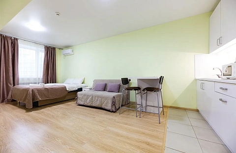 В ваших апартаментах есть мини-кухня с обеденной зоной и полным набором посуды, что позволит вам готовить любимые блюда. Вы также найдете удобную двуспальную кровать с ортопедическим матрасом для комфортного сна и раскладывающийся диван для отдыха. Среди удобств: кондиционер, бойлер, автономное отопление, микроволновая печь, холодильник, электрический чайник, варочная поверхность, утюг, гладильная доска, стиральная машина, фен, телевизор со Смарт-TV и Wi-Fi - все это для вашего максимального комфорта. В этой квартире полноценная ванная. Мы также предоставляем постельные и банные принадлежности, и набор для душа.