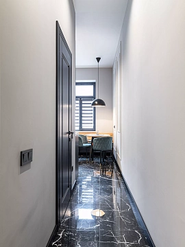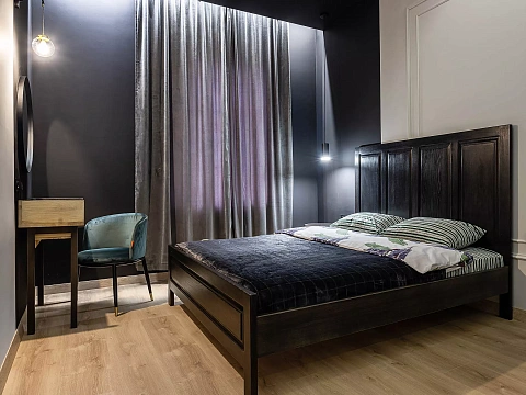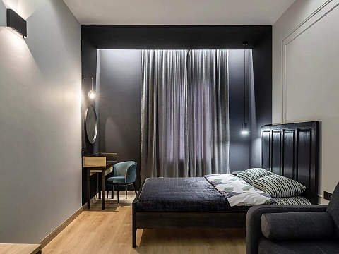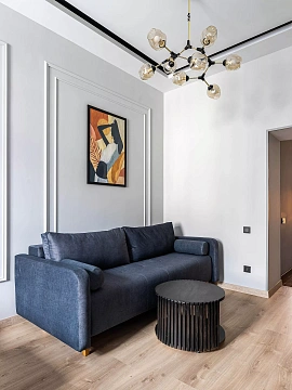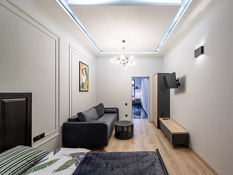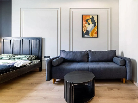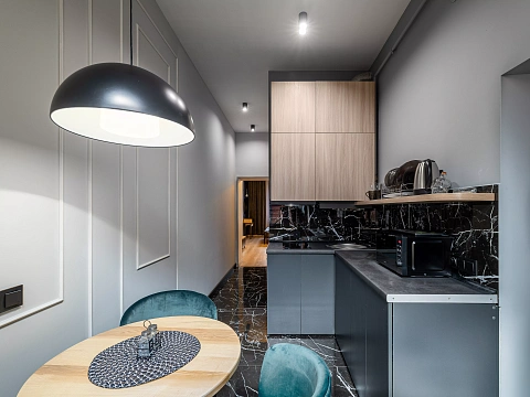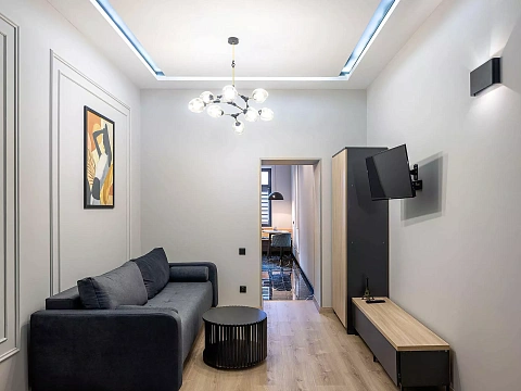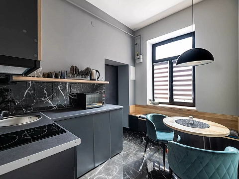 Все обустроено авторскими мебелью (двуспальная кровать, односпальный диван, обеденный стол), современной техникой (электроплита, микроволновая печь, электрочайник, холодильник, телевизор с плоским экраном, стиральная машина), всей необходимой посудой. Круглосуточная горячая вода, индивидуальное отопление, подогрев пола, высокоскоростной интернет. В квартире можно разместить до 3-х человек, идеальный вариант для небольшой компании туристов.