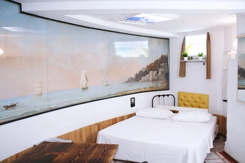 Світлий номер без вікна з панорамною морською картиною на всю стіну. Особливістю є хвилеподібне ліжко "Тантра". Кондиціонер і клімат-контроль підтримують комфорт. В номері є все для комфортного проживання; простір надихає, створює атмосферу морського затишку і умиротворення, ідеальний для відпочинку.