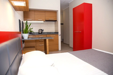 Апартаменти із сучасним стильним ремонтом! В них ви знайдете все для відпочинку та роботи: зручне двоспальне ліжко з ортопедичним матрасом, плазмовий телевізор, кондиціонер, стіл зі стільцями, кухня з повним набором побутової техніки, фен, праска, пральна машина, зручна душова кабінка, новий посуд, подушки, ковдра, чисті рушники та постільна білизна. Гаряча вода 24 години на добу, інтернет WI-FI по всій квартирі та окремий вхід з ліфтом. Також є можливість оформлення документів про проживання!