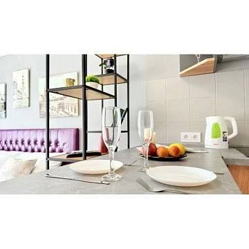 Повністю облаштована кухня: електроплита, чайник, холодильник, посуд